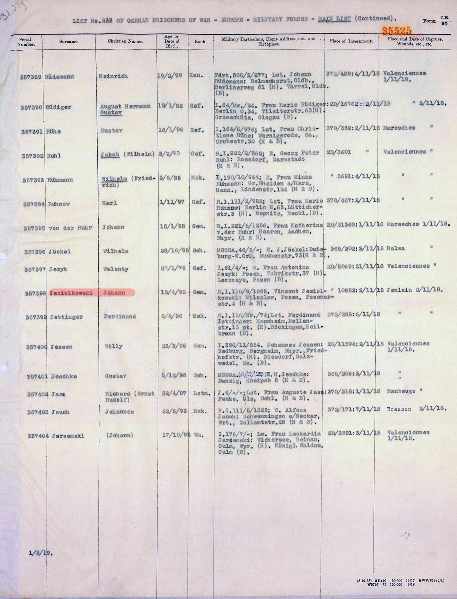 Brał udział w I wojnie światowej. Wcielony do armii niemieckiej walczył na froncie zachodnim, służąc w 9. Kompanii Reserve-Infanterie-Regiment numer 110. Tam dostał się 2.11.1918 r. do niewoli pod Jenlain (miejscowość i gmina we Francji, w regionie Hauts-de-France, w departamencie Nord). Przebywał w obozie jenieckim D2 pod numerem 10882.
