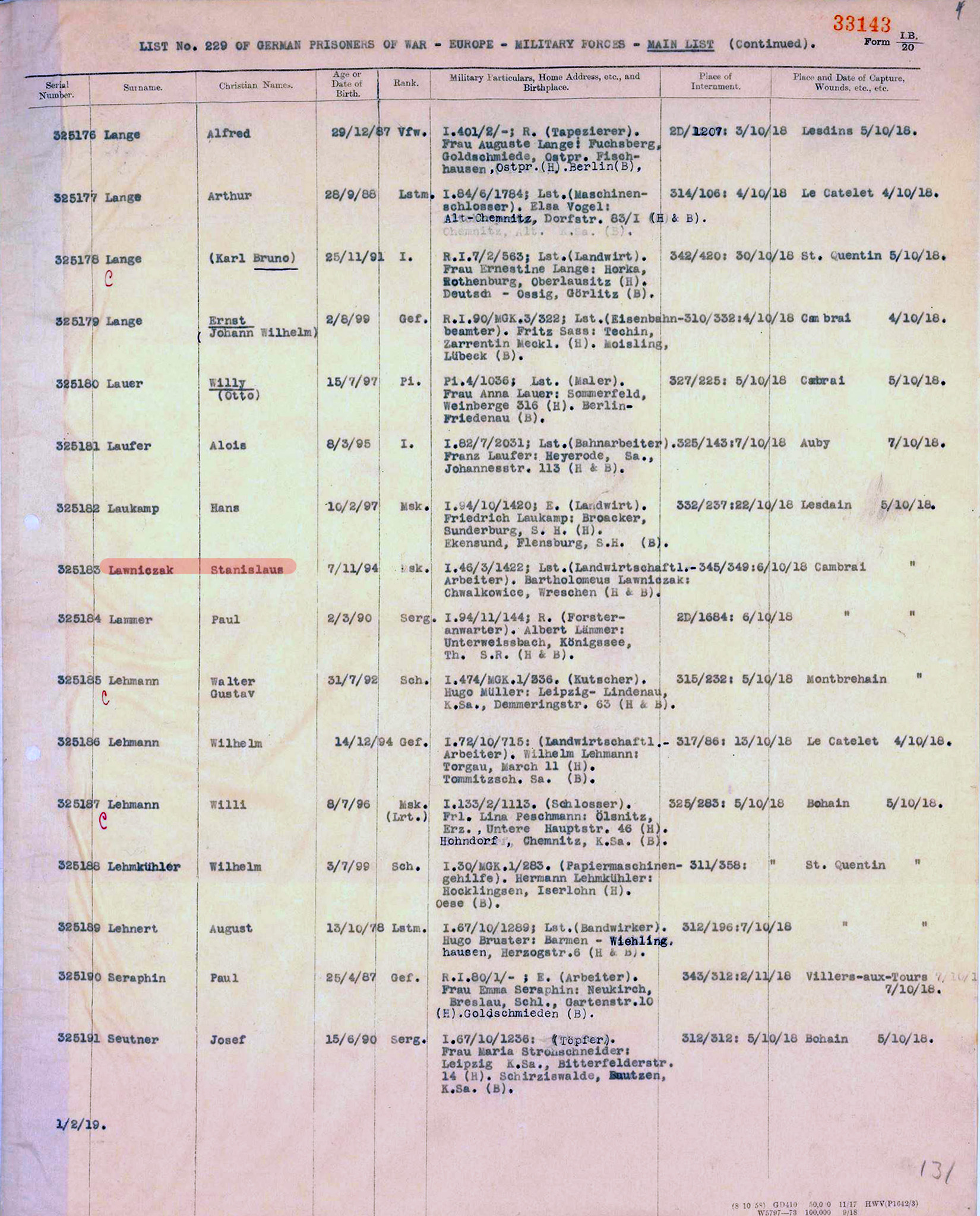 Podczas I wojny światowej został powołany do służby wojskowej i wcielony do armii niemieckiej. Służył w stopniu Musketier (szeregowiec) w 3. Kompanii Landwehr-Infanterie-Regiment numer 6 w Głogowie. Podczas walk na froncie wschodnim został wzięty 14.05.1915 r. do niewoli rosyjskiej. Wskutek pokoju brzeskiego został zwolniony w połowie 1918 r. z niewoli rosyjskiej i wcielony do 3. Kompanii Infanterie-Regiment Graf Kirchbach (1. Niederschlesisches) numer 46 z Poznania. Wzięty do niewoli angielskiej 5.10.1918 r. pod Cambrai. Jednostka wojskowa wówczas walczyła w składzie 119. Infanterie–Division.