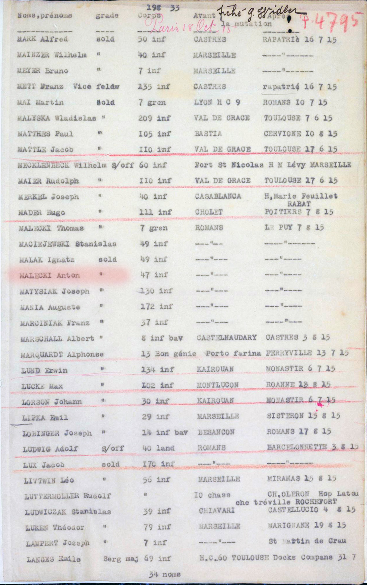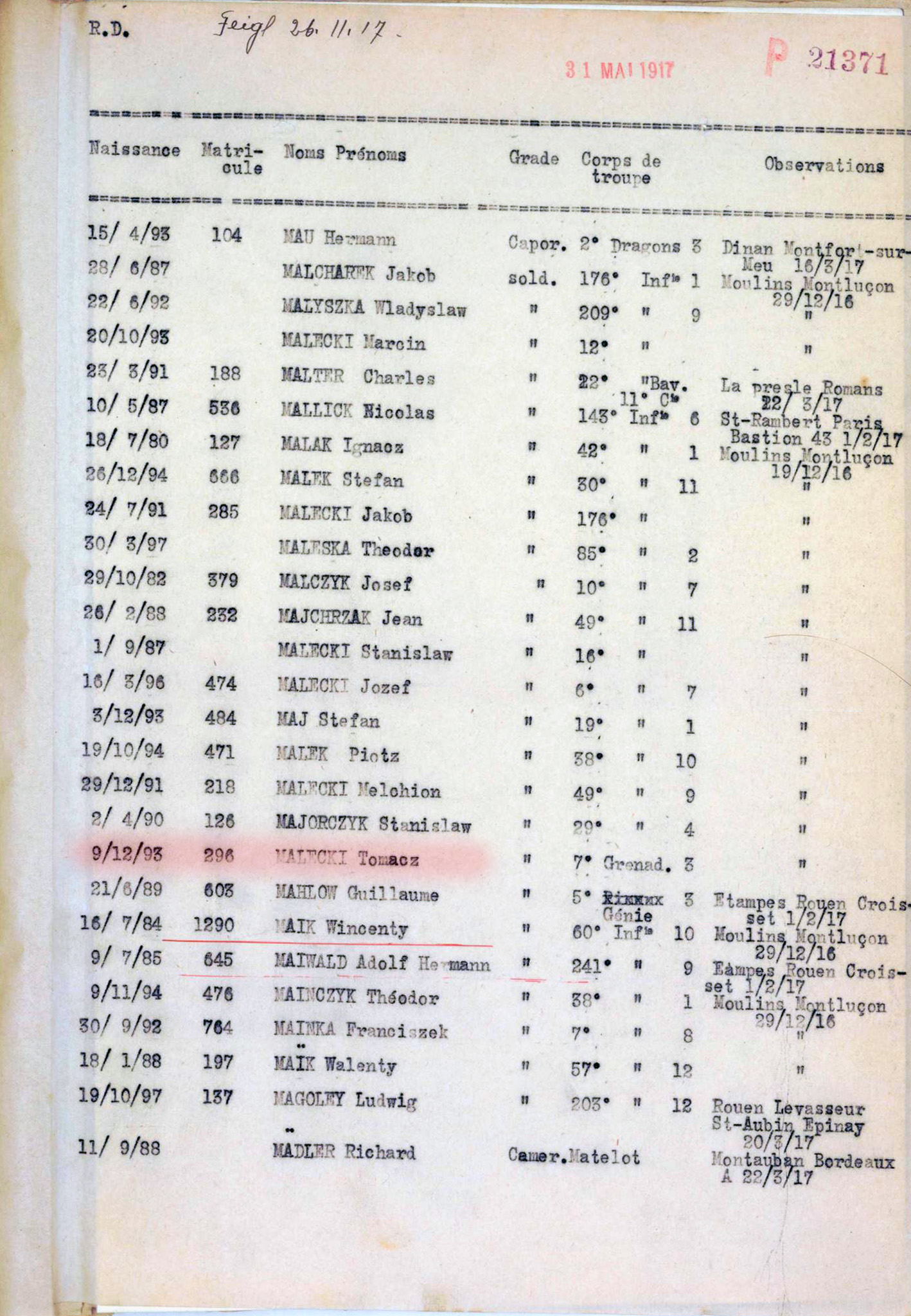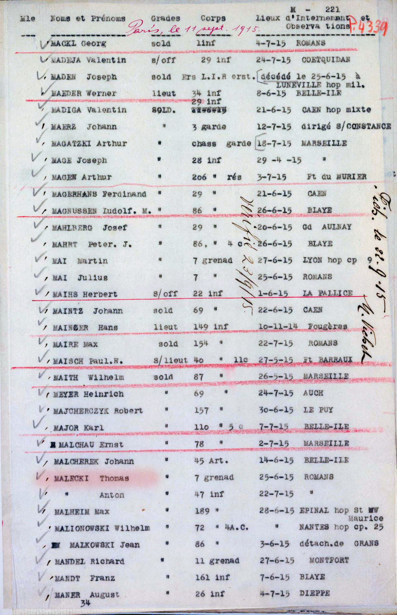 19 grudnia 1916 r. został przeniesiony z obozu Le Puy do obozu Moulins-Montluçon (miejscowości w regionie Owernia-Rodan-Alpy, w departamencie Allier).